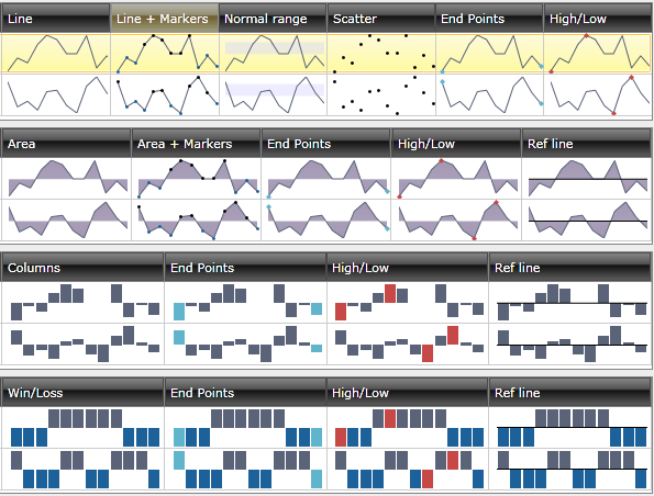 • Simple, yet powerful – While sparklines skip on some features that don’t make sense in their visualization domain they do have a lot of advanced functionality specific to them: