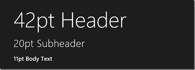 Achieving the expected typography is extremely easy, as long as you follow the accepted practices for HTML.  The headings (<h1> through <h3>) are styled with the correct font family (Segoe) and the correct sizes (42, 20, 11).  The next two headers tags (<h4> through <h5>) are also set at 11pt with diminishing font weights. The final header tag (<h6>) is set at 9pt and is used for tertiary information. Page headers should be set as <h1> elements, sub-headers as <h2>, and small sub-headers and main text should be set as <h3>, as the code in Listing 1 demonstrates and is displayed in Figure 2.
