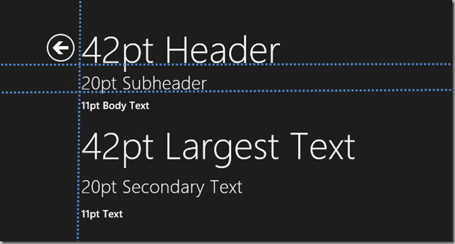Microsoft has been very forthcoming when it come to application layout in Windows Store applications, and built the CSS appropriately in the starter templates for JavaScript Windows Store Applications.  The layout is based on heat map studies and focus groups that determined the optimal use of screen real estate and typography.  Figure 1 shows the layout guidelines and the typography sizes.