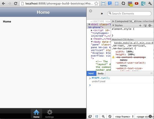 That will initialize the application in your browser. When you run this project in a PhoneGap project, it automatically calls the MYAPP.run when the device is ready. If you don’t want to use PhoneGap, just remove the reference from the index.html page and call MYAPP.run on page load.