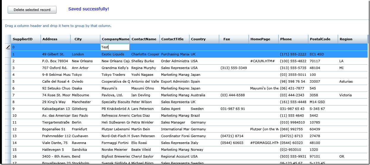 private void OnGridViewRowEditEnded(object sender, RecordRoutedEventArgs e) { DataRecord record = (DataRecord)e.Record; Supplier supplier = (Supplier)record.Data; // if the record is disconnected we add the new item to the collection that we use as data source if (record.IsDisconnected) { this.suppliers.Add(supplier); this.context.AddToSuppliers(supplier); this.context.BeginSaveChanges(SaveChangesOptions.ContinueOnError, this.OnSaveAllComplete, null); this.gridView.Rebind(); } else { this.context.UpdateObject(supplier); this.context.BeginSaveChanges(SaveChangesOptions.ContinueOnError, this.OnSaveAllComplete, null); } }