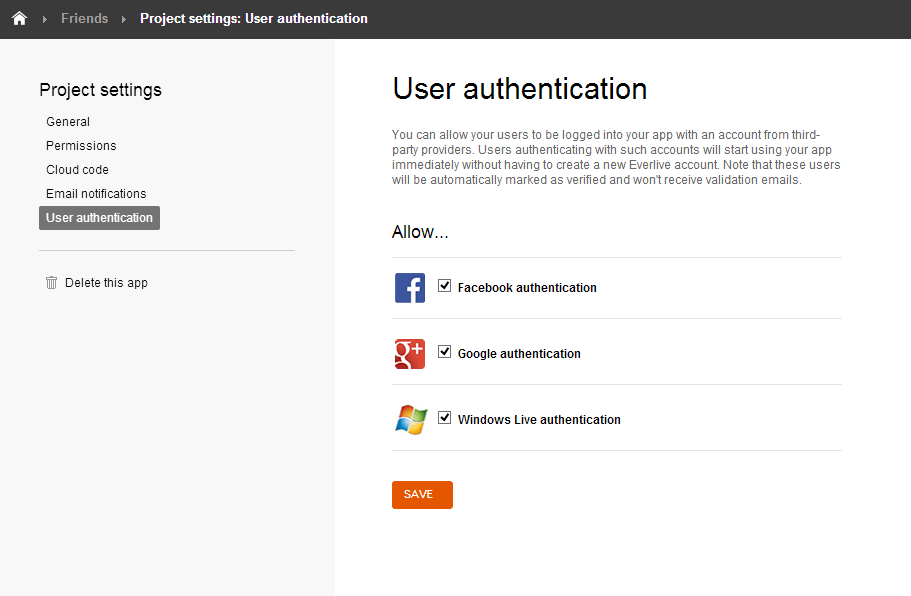 2) Go to Everlive's Backend portal, open your Everlive project, and navigate to the Project Settings section. Use the new tab “User authentication” to enable the providers you want.