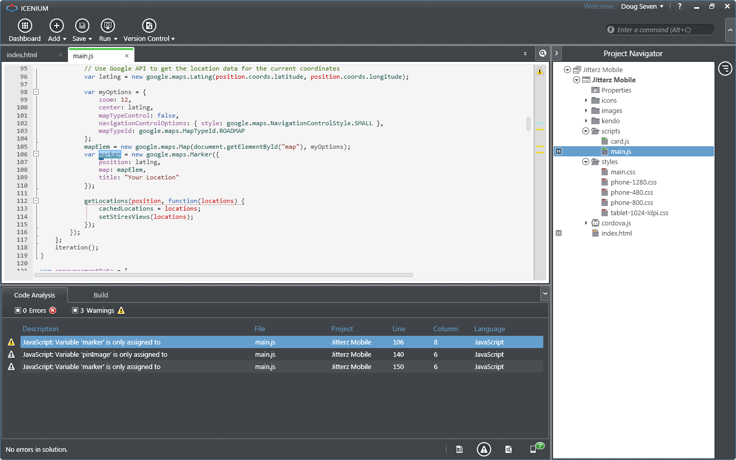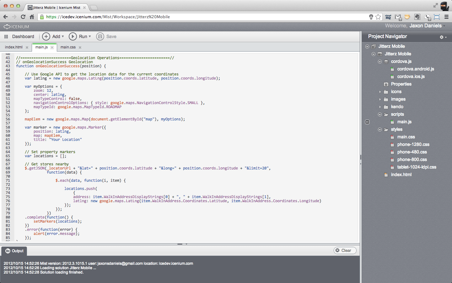 PhoneGap) to enable you to use HTML, CSS and JavaScript to build your application. When your project is compiled, we build the iOS and Android native bits in the cloud, which means you don’t have to think about SDKs, Objective C or Java. Just focus on your app and leave the platform dependencies to us. We also tailored the development experience to web developers. Most web developers (me included) prefer to work with capable, text-based code editors (and not WYSIWYG tools that modify your code without your consent), a browser and some debugging tools, such as WebKit Inspector, so we designed Icenium to work the same way. The Icenium coding environment is a simple text-based code editor, packed with advanced capabilities including syntax coloring and formatting, real-time error detection, refactoring, code navigation, and more.