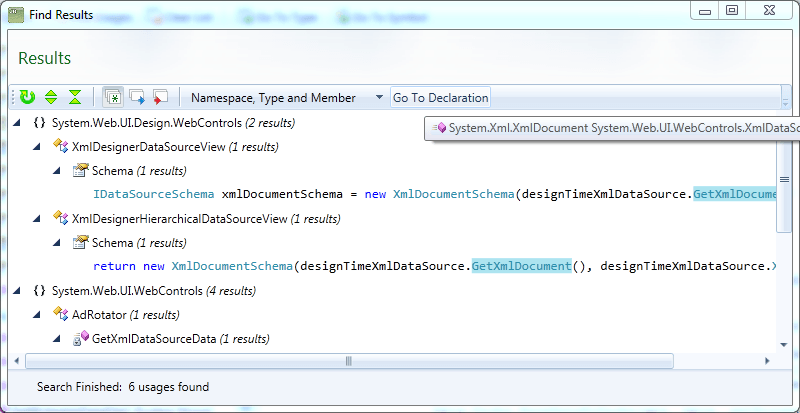 To find usages, press the CTRL key and click with the left mouse button on a type or member in the code tree view or directly in the code viewer. You’ll get a list of all usages and a preview of the exact line of code where the usage takes place. You can also group the results by different criteria.