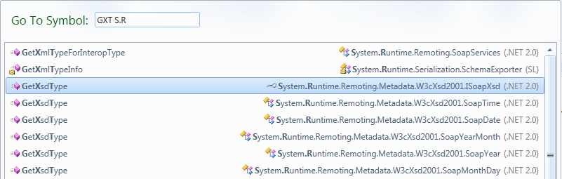 Simple search boxes are great, but JustDecompile goes beyond the simple box to provide powerful tools for searching code members. Based on the code navigation in JustCode, JustDecompile provides dialogs that let you quickly navigate to symbols and types. Simply type the name of the object you’re looking for, or take advantage of the same CamelCase search available in JustCode, which allows you to type the camel case letters to find a type or namespace (for example, “SR S.I” would show results like StringReader in namespace Sytem.IO).