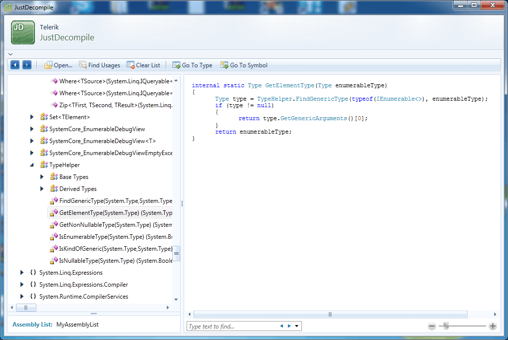 Of course the fact that we've made a free product is not the only thing that makes us proud. With JustDecompile, we went back to the drawing board to think about how a modern assembly browser and decompiler should work. We’ve incorporated innovations found in JustCode, such as powerful code navigation, and create a new decompiling tool that we hope will become the new standard for every .NET developer toolbox. Here are some things you’ll find in this first beta: