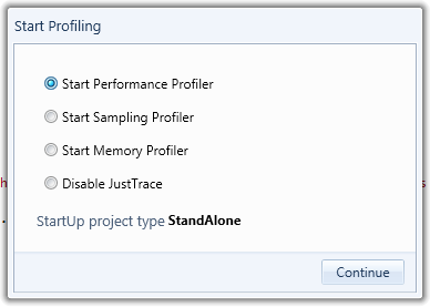 We made it very easy to use JustTrace with Visual Studio. Once installed and enabled, just press F5 (to run with debugging) or CTRL + F5 (to run without debugging) and you're automatically provided with a simple window to choose which JustTrace profiler to use.