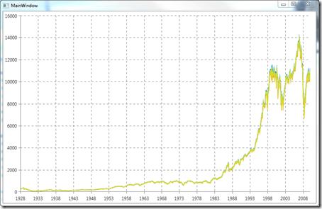 Let’s draw the Down Jones data for the last 70 years – in total 20 610 records. I will use a line series for each of the Open, High, Low and Close values. The data will be provided by a view model via the Data property. Here is the definition of the ChartDataSource:
