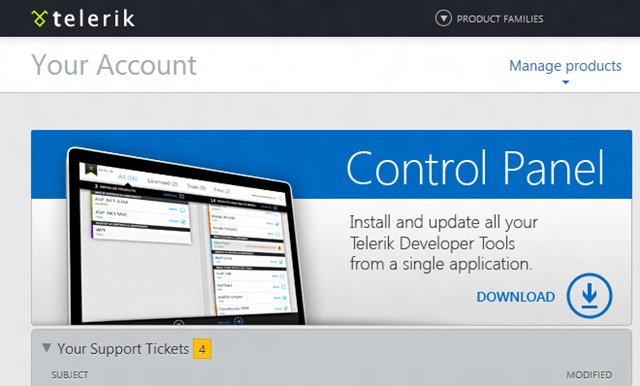To get started, download the Telerik Control Panel from telerik.com by visiting your account page. The option to download and install the Control Panel is front and center on the page.