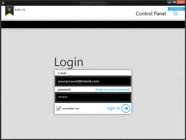 Upon launching the application, you will need to provide your Telerik account credentials then click the sign in button.