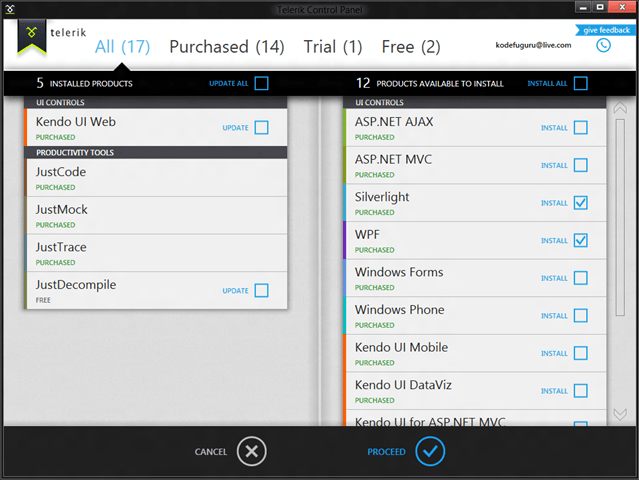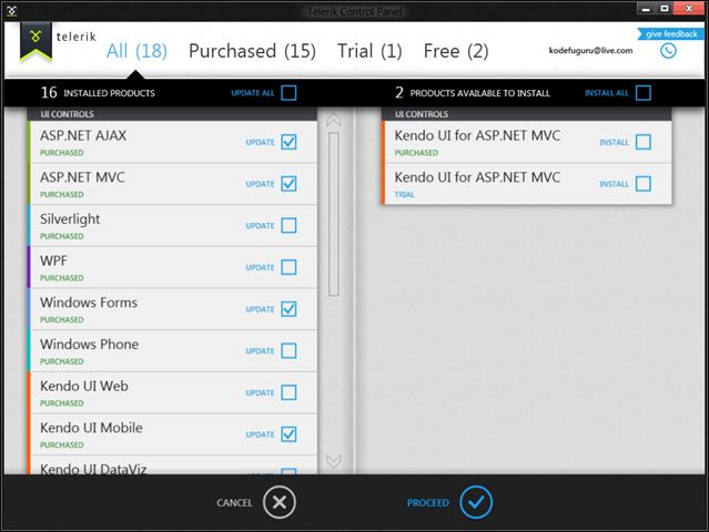 You can continue by selecting products to install or upgrade. The Telerik Control Panel makes it easy for you to install multiple products in one go. Simply select the products you wish to install, and the option to proceed or cancel will be displayed. You can mix and match purchased products, free products, and trial products.