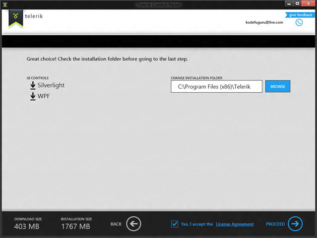 You will then be given the opportunity to review your choices and make changes to the installation folder. When you’re ready to proceed, accept the license agreements and click Proceed. If you forgot something or checked the wrong box, click Back and correct your selection.