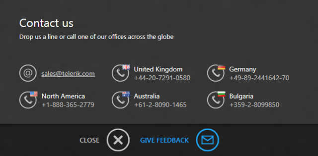 If you click the phone symbol below the button, a contact us screen is displayed with our sales email address and phone numbers for offices around the world.
