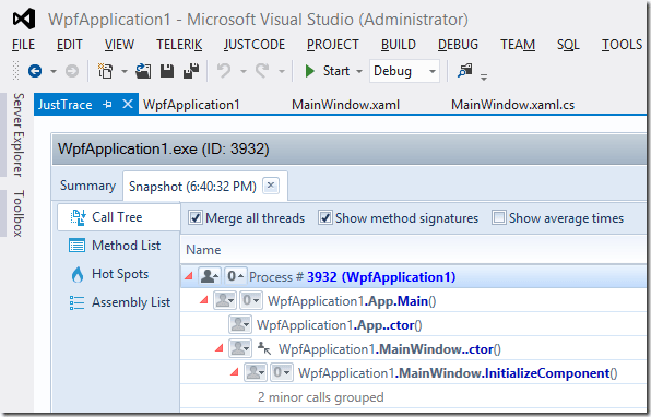 The standalone UI is only one way to access the powerful performance and memory profiling available with JustTrace. Another way to do it is from within Visual Studio 2012. Make sure the profiler is enabled and debug the application; a profiling session will begin in the new Visual Studio style tool window. It just works.