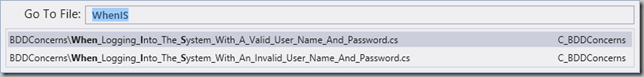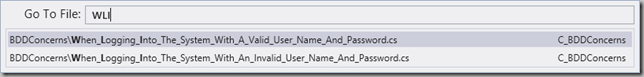 Entering capital letters (or a combination of capital letters and lowercase letters) into the search box will filter the files accordingly. For example, I know that I have two BDD concerns that test logging in, both starting with “When_Logging_In”. By Typing “WLI”, the Go To File dialog filters down to the files that have the capital letters W,L,I in their name (in order). The result is shown in Figure 1.