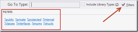 By checking the check box in the upper right corner of the Go To Type or Go To Symbol dialog boxes, a set of clickable filters will show in the dialog box (as in Figure 6). NOTE: You can still use the filters without checking on the Filters check box by typing them in manually – the addition of the Filters section into the dialog (shown in the red box in Figures 6 and 7) is a helper screen.