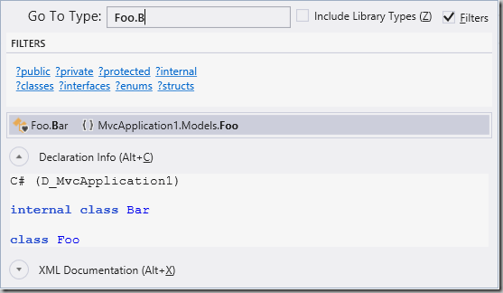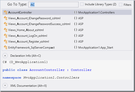 Camel Case Searching for Types or Symbols works the same as when filtering Files in the Go To File dialog. In addition to filtering the types or symbols based on the camel case name, the Declaration Info section (middle bottom of the dialog box) gives a preview of the type’s (symbol’s) declaration. There is also a section (at the bottom of the dialog) that will show the XML Documentation (if any exists). Figure 5 shows an example of filtering for Types on the letters “AC” in a typical ASP.NET MVC application.