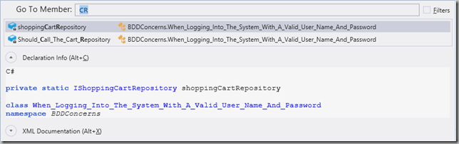 Just as with Go To File/Type/Symbol, Go To Member supports camel case searching as well (as illustrated in Figure 10).