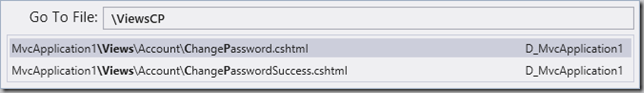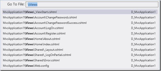 Typing “\” in search box will look at the directory structure for your projects in your solution. I find this especially helpful when I am working with ASP.NET MVC projects. For example, if I want to find a particular view, I can type “\Views” and it will filter down to all of the files in the “Views” directory, as in Figure 3.