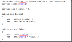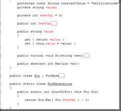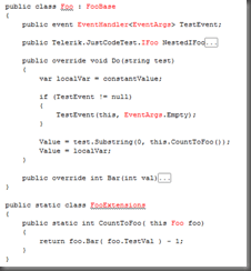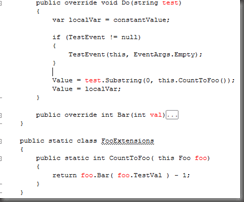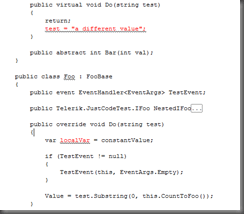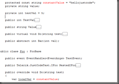 Note: This code snippet contains at least one of every item JustCode colorizes. I turned off all colors in VS, and then adjusted the single JustCode setting to show how that single setting affects the UI.  Where specified 2 markers may work together.