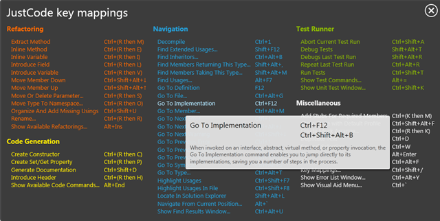 The key mappings window is there to help you discover JustCode’s keyboard shortcuts that are available. It will also help you discover if the shortcuts have been removed by another tool. Refer to the original article and the follow-up if you are interesting in becoming better with JustCode and the keyboard. The shortcut to access the window is Ctrl+Shift+/.