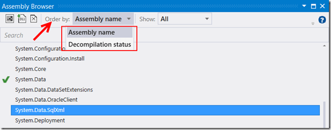 These options are shown in Figure 5.  When selecting Decompilation status, all of the decompiled assemblies are listed first (in alphabetical order) followed by the non-decompiled assemblies.