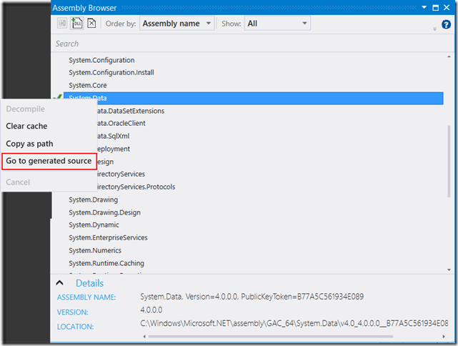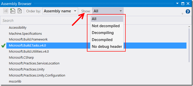 There are several updates to the Assembly Browser Windows.  In case you haven’t seen this window before, it’s one of the key features that makes Debugging Decompiled Code so incredibly easy.