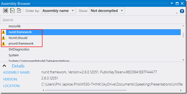 I typically use NUnit, and when you look at the related files in the Assembly Browser, you get the “Caution” sign (as in Figure 1).