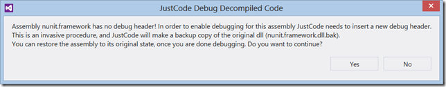 Another big feature that comes with the service pack is the added ability to debug into dependent assemblies that don’t have valid debug headers!  For example, if you use NUnit and would like to debug into any of the assemblies that come with NUnit or NUnit Should, you used to be out of luck.  Not anymore!