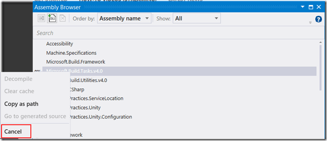 You can now cancel a decompile request. Once a decompile has started, the context menu provides the option to Cancel (as shown in Figure 3).  But you have to be fast – the Cancel option is only available during an active decompilation, and JustDecompile is extremely fast, so the option doesn’t stay active very long.