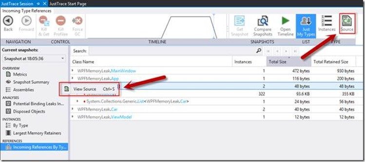 In addition to support for VS 2013 Preview, other features designed to make JustTrace even easier to use. You’ve always been able to “view source” in JustTrace from the Performance Profiler. SP1 adds the ability to “view source” from the Memory Profiler as well via the right-click context menu or the “Source” toolbox button. (Figure 1)