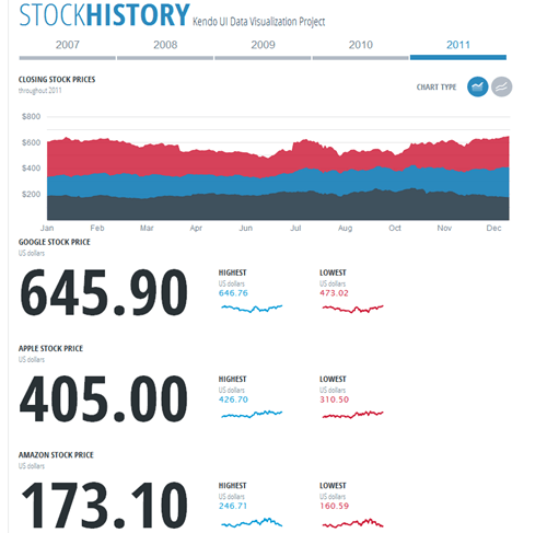 In Kendo UI DataViz, we've added the new Area Chart type, multiple value axis support, radial gauges and linear gauges. These tools help you easily create interactive dashboard-like interfaces on desktop and mobile devices. Equipped with stunning animations, they are pure (nutritious) eye candy.