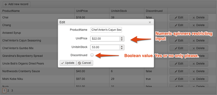 The popup editor displays a new window for editing a row. These windows can contain other widgets for editing, such as drop downs and checkboxes. Combined with a customer editor template, this gives you absolute control over the editing experience.