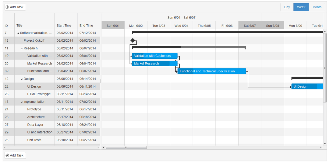 If you’ve ever wanted to have a better view of a project planning and management process, the new Gantt widget is for you. Combining a treelist view for task definitions and a schedule view for visualizing time periods and relations between tasks, it is the perfect data visualization companion for project managers who want to control and supervise their projects at any given moment. Data editing via insert, delete or edit task operations (via resizing) are supported out-of-the-box, as well as keyboard navigation and MVVM.