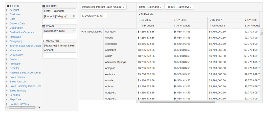 This powerful, long-anticipated widget (#1 voted on our UserVoice portal) allows you to process multi-dimensional data supplied via OLAP cube or JSON arrays, thus bringing BI capabilities to your web applications. It is invaluable for scenarios where data mining and analytics are required. This first release has built-in capabilities for columns, rows and measures drag & drop customization, scrolling and filtering. Make sure you first get familiar with the pivot grid fundamentals help topic and how to setup OLAP cube/XMLA to speed up the learning curve.