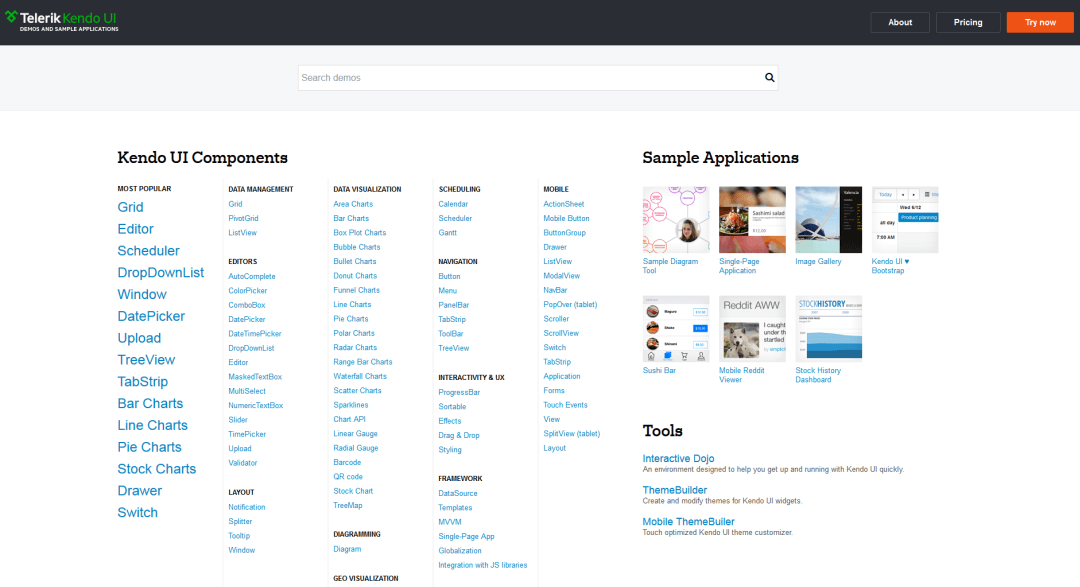 To see demos for server technologies (ASP.NET MVC, JSP or PHP) or browse the online support resources for a given widget, use the navigation links at the bottom of each demo.