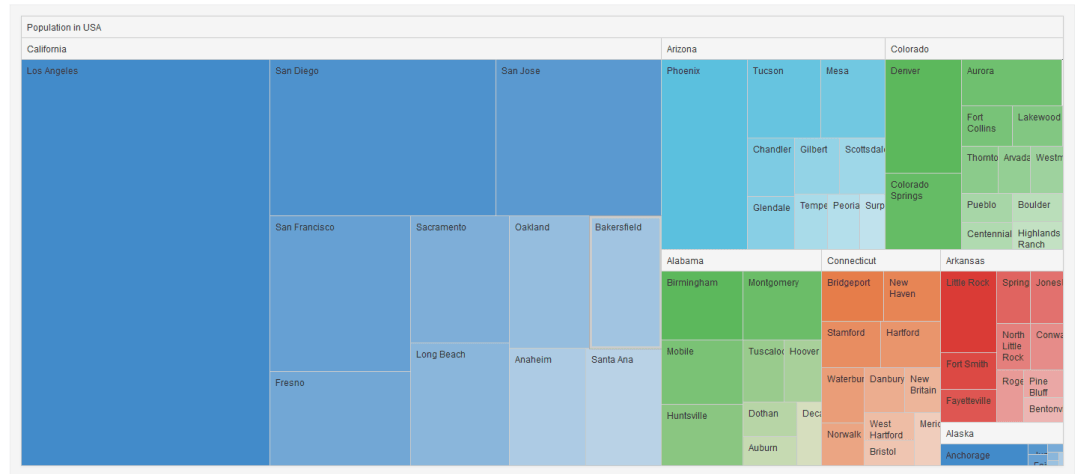 If you want to display hierarchical (tree-like) data using nested rectangles, this is where the TreeMap widget shines. Each nested rectangle in the treemap structure represents sub-nodes and you can easily distinguish parent/child items using this type of graphical representation. This can be quite useful for outputting segmentation in populations, results from political polls/elections, and so on. ‘Squarified’ and ‘Slice and Dice’ (horizontal and vertical) modes are supported via simple configuration settings.