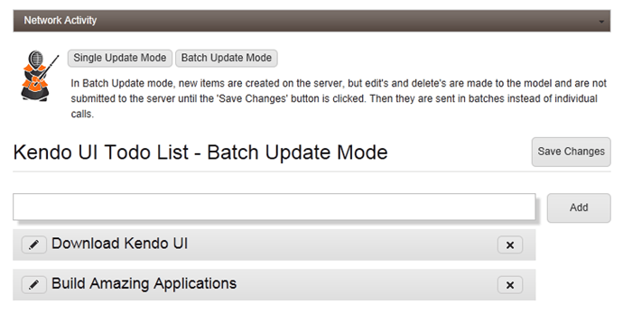 Since then, I’ve had some time to update the application to support full create, read, update and delete operations. It has a “Single Update Mode” where all actions occur immediately on the server and are reflected in the UI. It also has a “Batch Update Mode” where actions are saved with the “Save Changes” button is clicked.