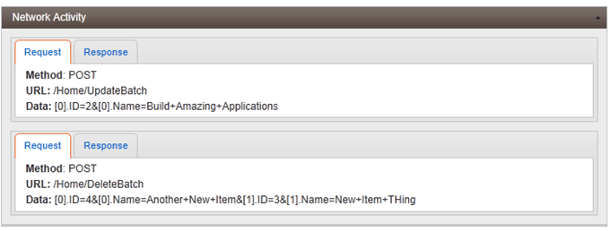 I also added a “Network Activity” panel that uses a Panel Bar widget and a Tab Strip widget. This shows each request and response made from the client to the server. You can of course do this at a much more detailed level by examining the requests in your respective browser tools.