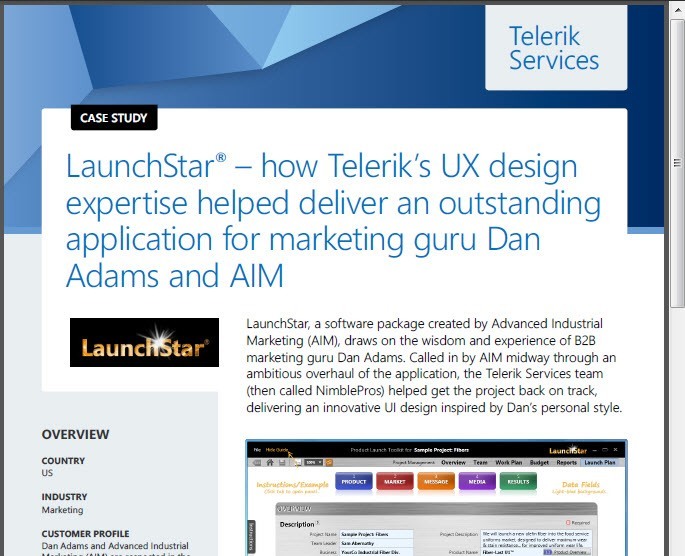 Telerik Services recently published a case study involving work done with Advanced Industrial Marketing (AIM) on their LaunchStar product.  You can find the full case study on the UX and Design section of our website.