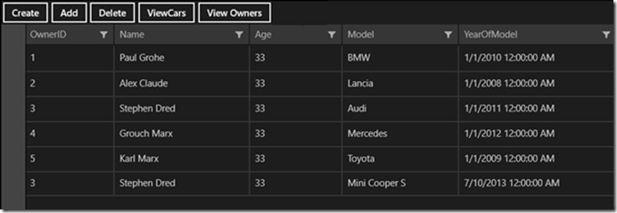 There is a Show Owners button whose handler simply calls DisplayCarsAndOwners, which does a more complex selection of the data, joining the two tables and extracting the interesting data as a new ItemsSource for the DataGrid,