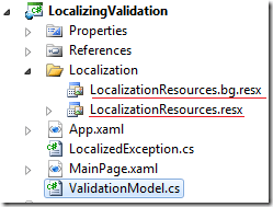So if you already have localization then all you need to localize your validation is to add property to the exceptions that will serve as ResourceKey for looking up in the dictionaries and a tiny little style that will make use of the keys and the localization manager. Your errors will be translated. You can add your own set of languages.