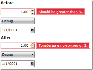 A few months ago we noticed a lot of XAML code being copied around. It was supposed to enable validation in our controls. It is all about those red borders showing around controls like RadNumericUpDown, RadComboBox, RadDatePicker etc. So we have created the ValidationTooltip in the assembly Telerik.Windows.Controls, namespace Telerik.Windows.Controls.Chromes that was supposed to encapsulate these visuals keeping all the storyboards and templates at one place. This all happened in Silverlight 3. Now in Silverlight 4 we have implicit styles which means that we can style these ValidationTooltips in all controls using a single implicit style for the ValidationTooltip. What is more important for this blogpost is that the ValidationTooltip has TooltipContent property which is set inside the ControlTemplates like this: