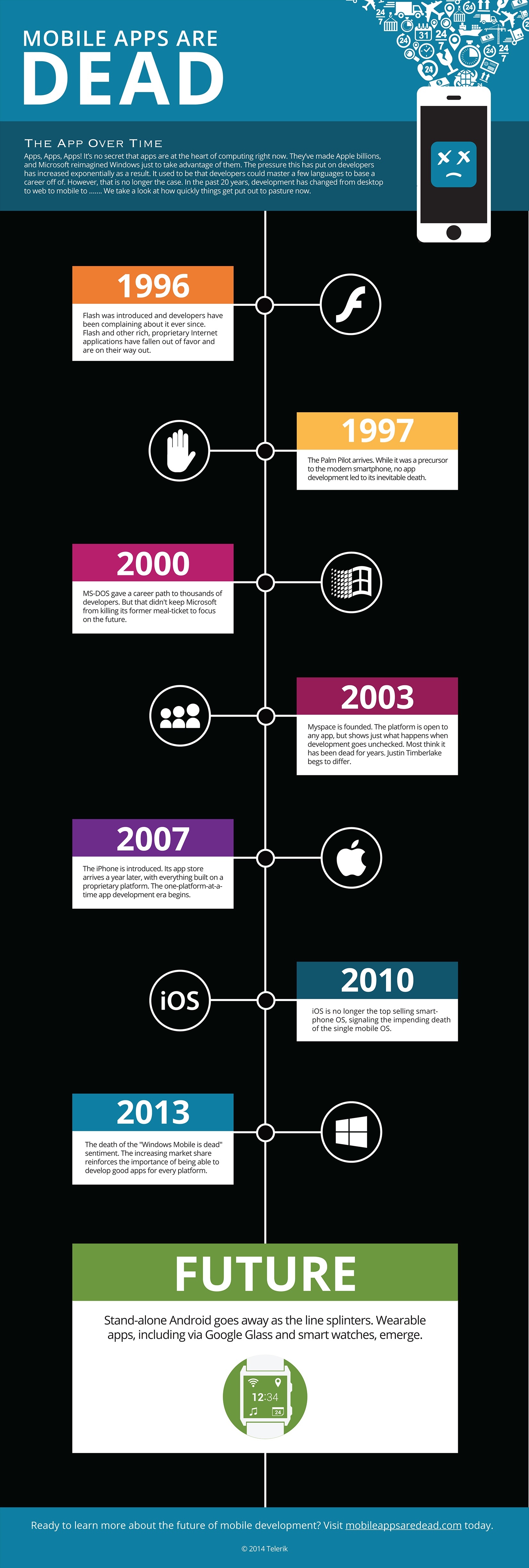That’s the point of the Mobile Apps Are Dead infographic—a quick view into things that have helped build the modern world, but haven’t survived the journey. On Wednesday, February 12th we will reveal the details of Telerik Platform—the best way to create innovative experience for any device or any platform using the most appropriate approach. We want to future-proof your bragging rights—that’s just how we roll.