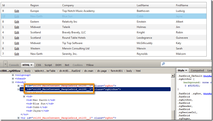 Note the grid control has created an ID value for that row – and that ID is completely position-based: ctl00_MainContent_PeopleGrid_ctl00__1. (Look at the row above and below. The IDs all end with “__<number>”.)