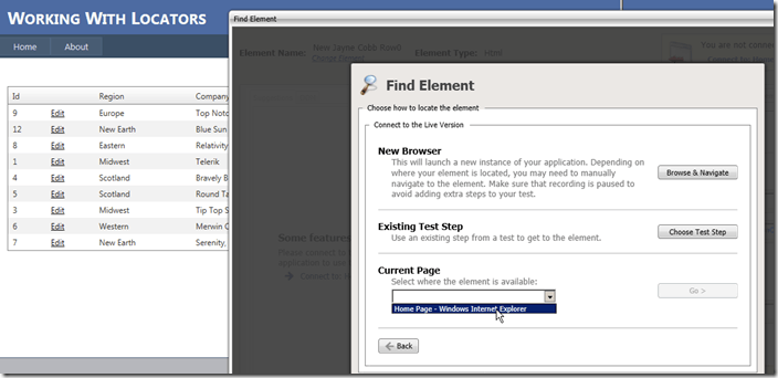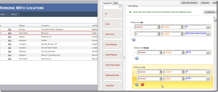 By default, Test Studio’s recorder will define this row’s locator using that ID value. Normally IDs are the preferred route to use since your test script will always find that element regardless of where it is on the page.