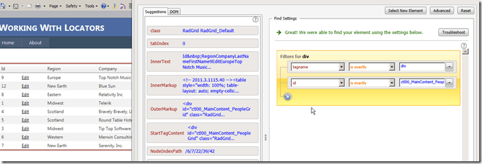 The great thing about the Live Connection is you can see the highlighted area on the live IE instance as you’re building your chained expression. For this example I start with the outer DIV element holding the grid. As you can see below, I’m using an explicit tagname filter plus the ID of the element. I’ve also clicked the Validate button which checks my find expression’s validity against the current DOM and highlights the portion of the page that’s selected via the Find expression.