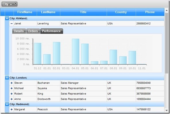 GridViewTemplate template1 = new GridViewTemplate(this.radGridView1); Template1.Caption = "Details"; Template1.DataSource = detailsTable; this.radGridView1.MasterGridViewTemplate.ChildGridViewTemplates.Add(template1); GridViewTemplate template2 = new GridViewTemplate(this.radGridView1); template2.Caption = "Performance"; template2.DataSource = chartTable; this.radGridView1.MasterGridViewTemplate.ChildGridViewTemplates.Add(template2);