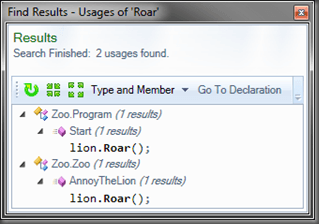 If you hold Ctrl and click on the Lion definition you will see all the usages of the Lion type; if you click on the Roar method definition you will see all the usages of the Roar method: