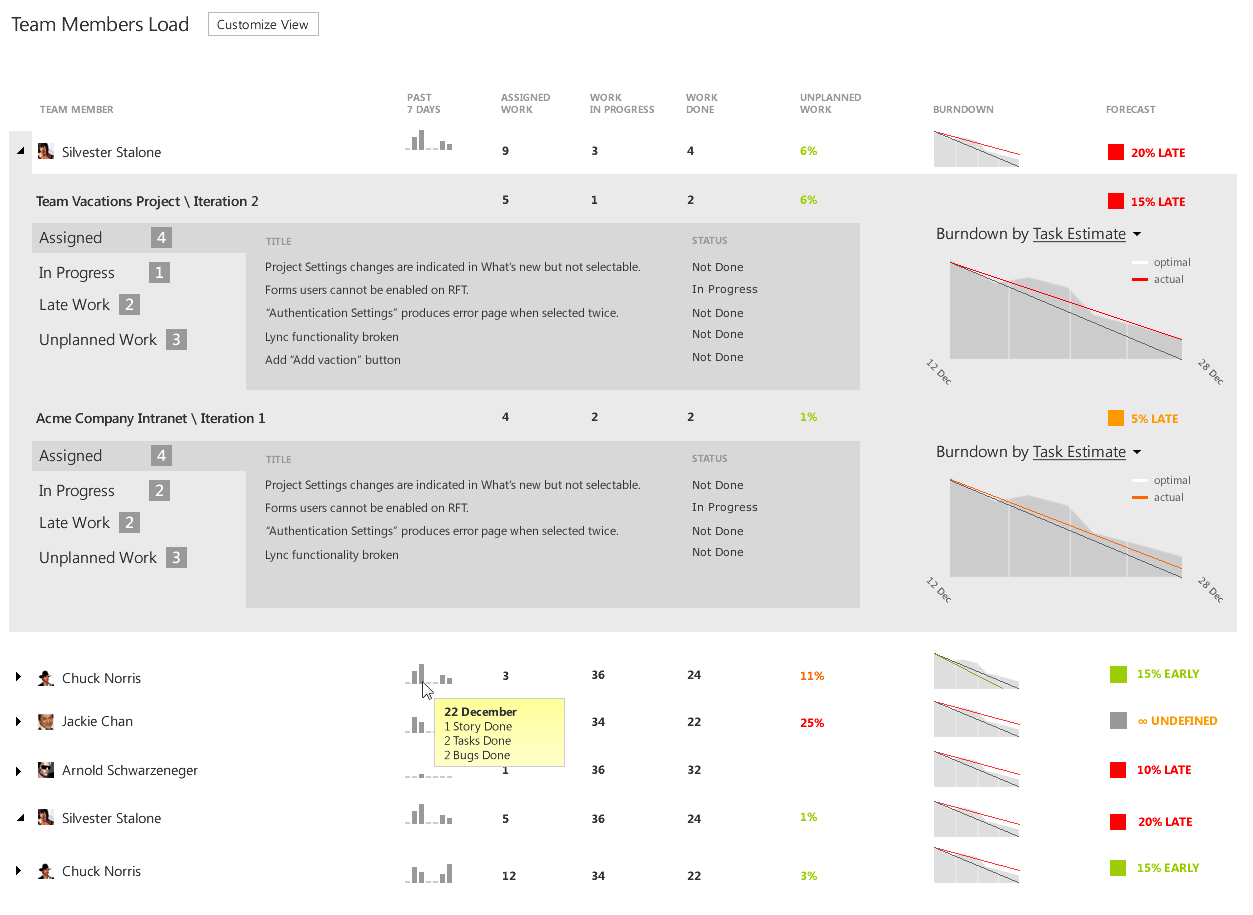 You can see that we have an expanded and collapsed view – the collapsed showing only summary information, and the expanded view showing a “bit” more detail. The screen highlights blocking bugs, issues, activity from the Feedback Portal, progress of the iteration, an iteration burndown and some indicators that help you to see if you’re going to hit expectations and if not, how late could you be based on your current velocity, how many stories might not get addressed, and what amount of unplanned work the team is dealing with.